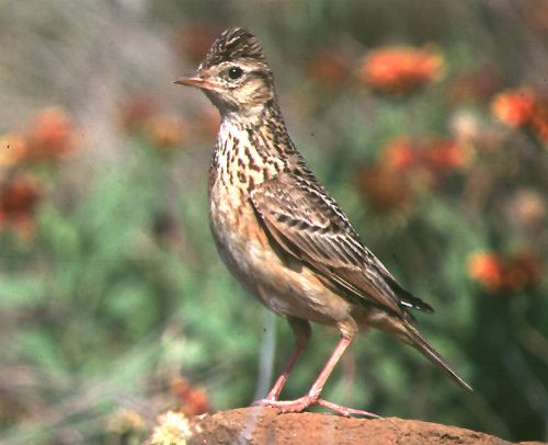 澎湖小雲雀 相機鏡頭:NIKON F90X / Nikon 600mm F5.6 光圈快門:f5.6 1/640sec 拍攝日期:86年5月 拍攝地點:鳥嶼 〔附記〕 澎湖最具特色的野花是天人菊,每到盛夏,滿山遍野,點染了每一塊土地. 而澎湖最具代表性的鳥,則是小雲雀,初春時,草原上,天空中,放聲鳴唱. 因此,心中一直有幅小雲雀與天人菊對話的畫面. 一個風和日麗的下午,我漫步於山徑,兩旁己是紅花遍布,正陶醉於此美景時, 突然左邊的草叢裡竄出一隻鳥來,大約飛了十公尺即停下,神情緊張的看著我, 牠的行為,讓我不禁測是否有巢在此附近,我找了一下,果真在一叢天人菊下發現了六個蛋.