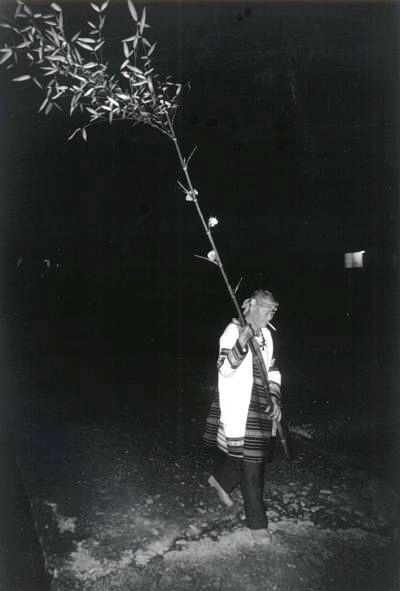 瑪厚(祖靈祭)清晨,頭目舉著祭祖用的綠竹,在路口等待
